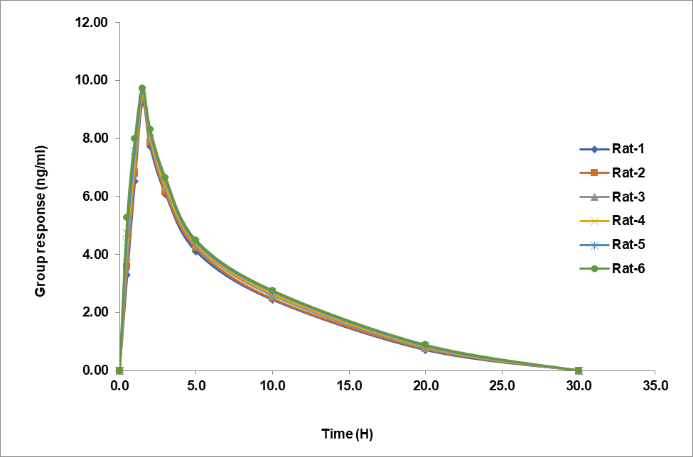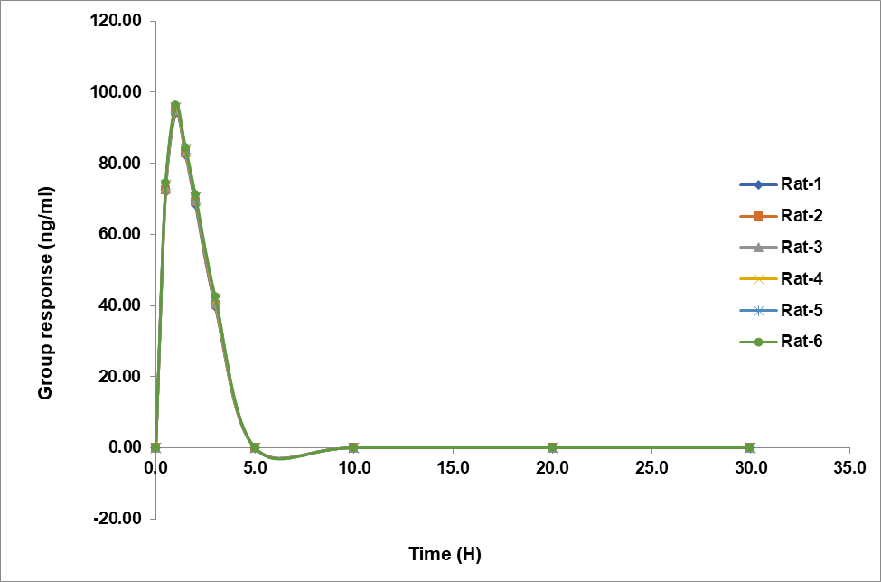 Six healthy rats weighing about 250 g were procured from Biological E Limited in Hyderabad, India, for the purpose of conducting in vivo pharmacokinetic investigations. Institutional Animal Ethics Committee approval (Reg. No: 1074/PO/Re/S/25/CPCSEA) was obtained for the animal research protocol. The animals live in controlled environments with access to fresh corn, endive, and carrots. Their diet should be maintained at a temperature of 21-24 ᵒC and a humidity level of 50-55%. There was an overnight fast and free access to water for all animals before the experiment [18].