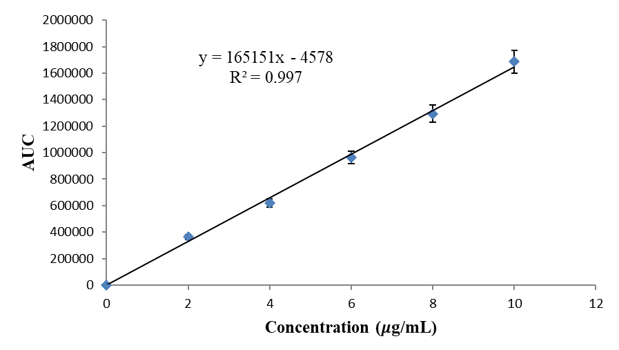With five different concentrations of t-RES solutions ranging from 2 to 10 µg/ml, the calibration curve was developed. To verify overall linearity, plotted the peak area against the standard concentration while implementing the least squares approach to generate a line of regression. The acquired data were analyzed using Microsoft Excel and the least squares approach for linear regression [43].