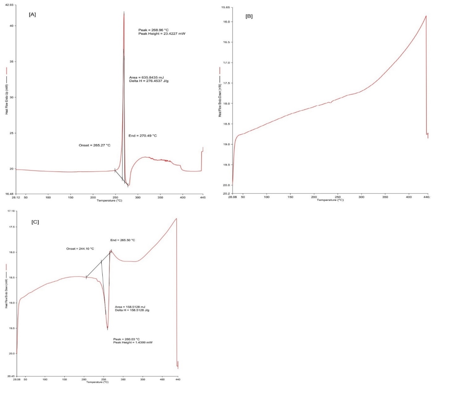 Thermal analysis was performed for given sample by using a DSC (Perkin Elmer DSC 6000)Q10 at the range of temperature 20 to 400 °C with rate of heating was 10 °C/min for the determination of melting point and drug interactions [47, 48].
