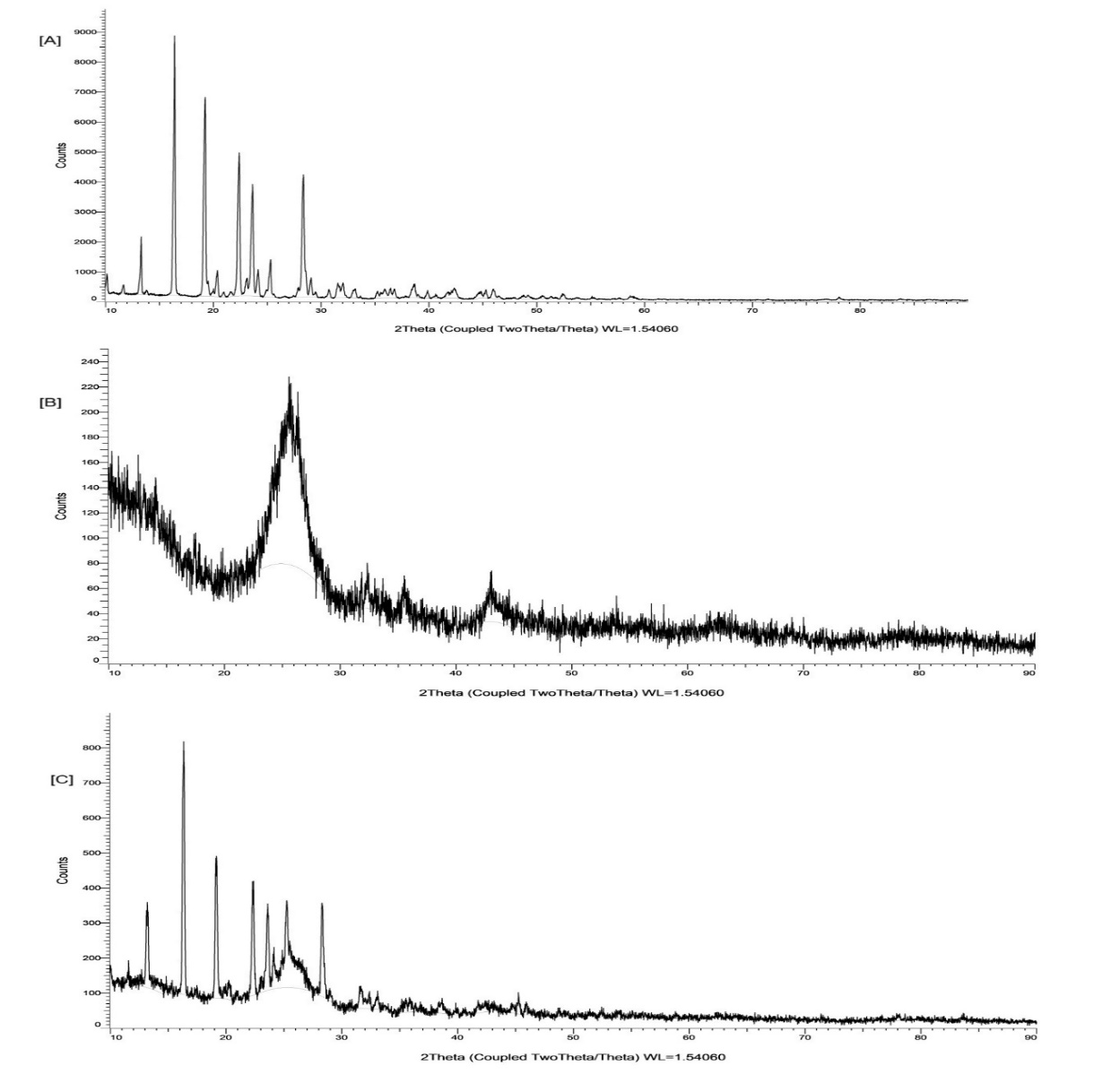 X-ray diffraction (XRD) examination was conducted in order to ascertain the physical condition of t-RES. Fig. 6A illustrates the presence of distinct peaks at specific angles, particularly 16.43°, 19.23°, 22.43°, and 28.33°, which provide evidence supporting the high crystallinity of pure t-RES. Further, on comparing the XRD pattern of COOH-MWCNT (fig. 6B) with that of t-RES-MWCNT formulation (fig. 6C), the loading of t-RES on COOH-MWCNT was confirmed.