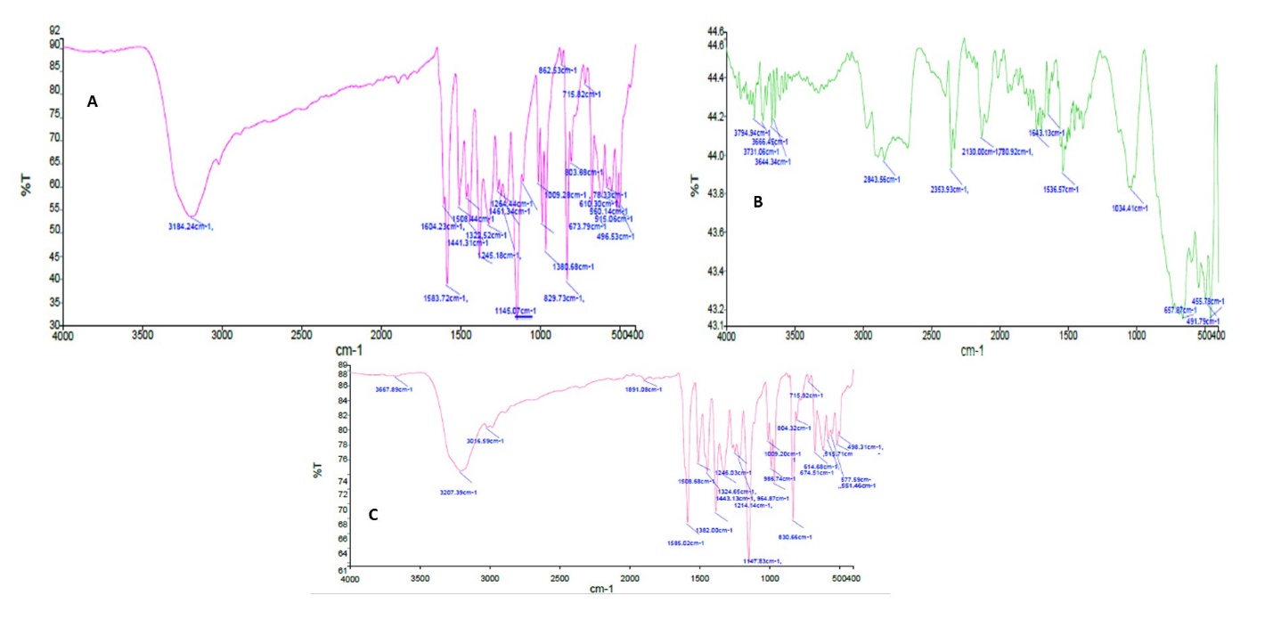 Fig. 7: FTIR spectrum of [A] t-RES, [B] COOH-MWCNT, and [C] t-RES-MWCNT