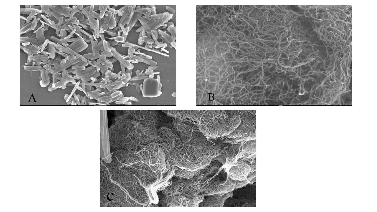 Fig. 8: FE-SEM images of [A] t-RES, [B] COOH-MWCNT, and [C] t-RES-MWCNT