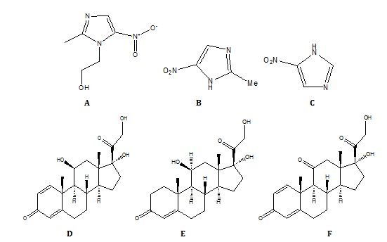 Fig. 1: Chemical structures of (A) Metronidazole (B) Metronidazole impurity-A (C) Metronidazole impurity-B (D) Prednisolone (E) Prednisolone impurity-A and (F) Prednisolone impurity-B