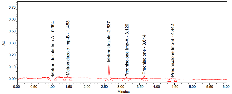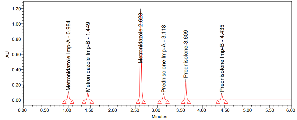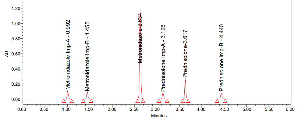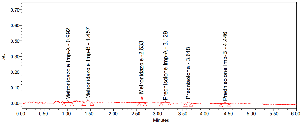 They accurately weighed and transferred 5 mg each of Metronidazole impurity-A, Metronidazole impurity-B, Prednisolone impurity-A, and Prednisolone impurity-B working standards into a clean, dry 10 ml volumetric flask. Diluent was added, and the mixture was sonicated to ensure complete dissolution. The volume was then made up to the mark with the same solvent. Subsequently, 1 ml of this solution was transferred into another 10 ml volumetric flask and diluted to the desired concentration with diluent.