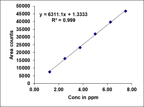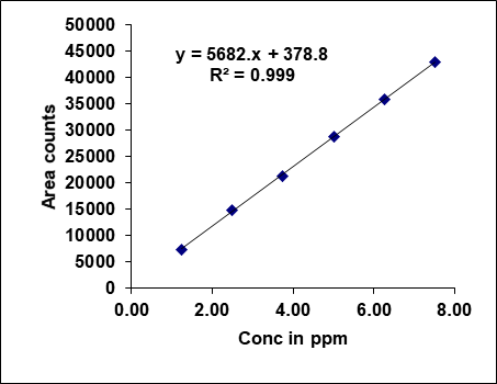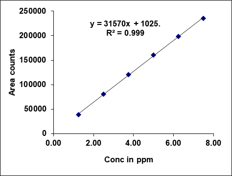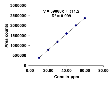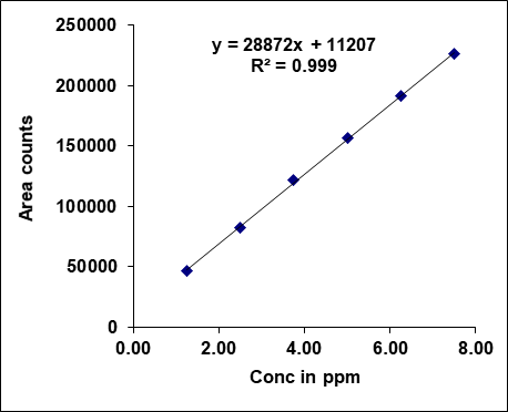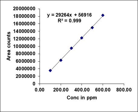 The analytical technique can only provide results within a certain bound, which is known as its linearity. The linearity spectra were evaluated using six different series of standard solutions, with peak area proportional to analyte concentration in the sample. The calibration curve was created and the regression equations were measured by plotting the peak area against the concentration of the standard solution. The intercept, slope, and coefficient of correlation were measured using the technique of least squares.