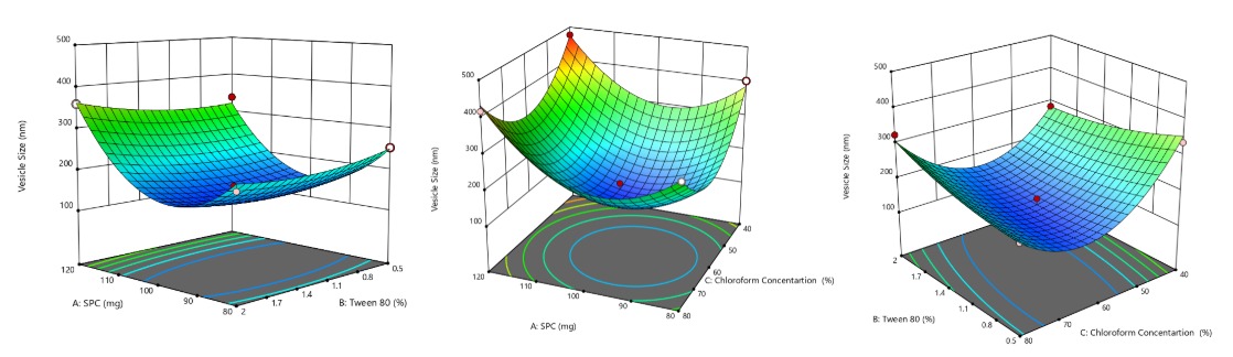 Where A, B, and C represent the coded values of SPC, Tween 80, and chloroform concentration, respectively. Positive coefficients indicate synergistic effects, while negative coefficients suggest antagonistic interactions. The 3D response surface plots (fig. 1) illustrate the interactive effects of these variables on vesicle size. These findings affirm that the formulation components notably influenced vesicle characteristics, with the regression model statistically validated (p<0.05), as summarised in table 3 and fig. 1.
