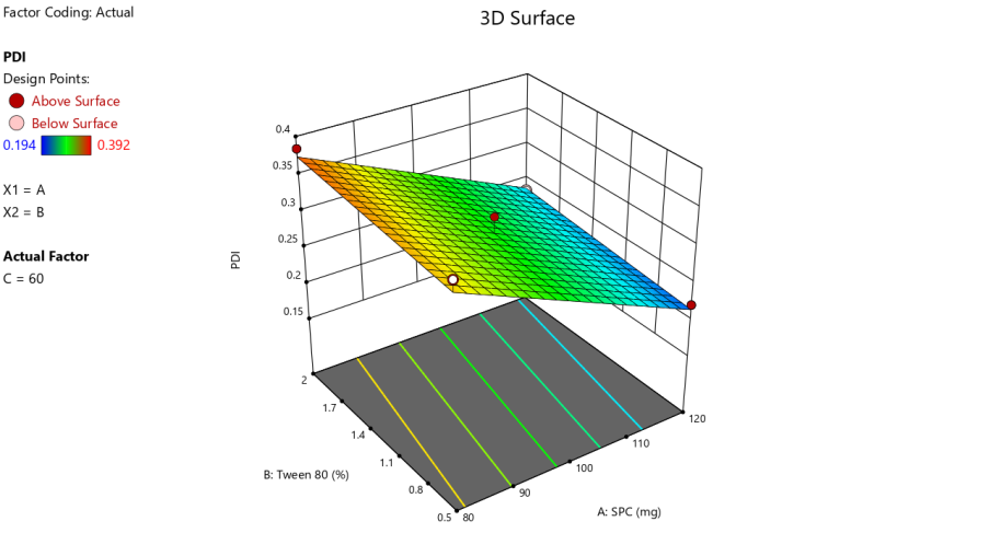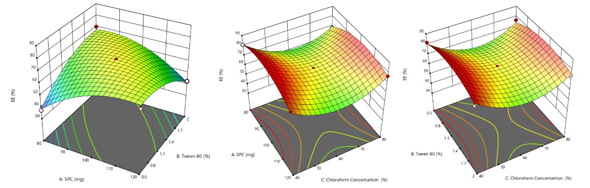Where A, B, and C represent SPC, Tween 80, and chloroform concentrations. The response surface plot (fig. 2) demonstrates the individual and interactive effects of these variables on PDI.