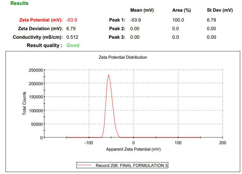 The zeta potential of the optimized formulation was determined by electrophoretic light scattering using a Malvern ZetaSizer. A high negative potential (−53.9 mV) indicated good physical stability due to electrostatic repulsion between particles [19].