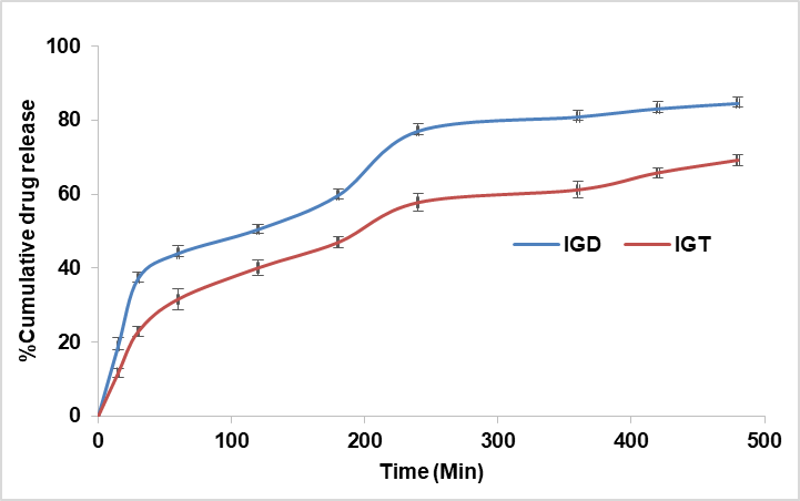 Drug content analysis revealed 95.9±0.71% for IGT and 97.8±0.58% for IGD, indicating uniform drug distribution within the gel matrices. The slightly reduced drug content in IGT could be attributed to drug encapsulation within lipid vesicles, which may influence release during assay. These findings confirm that the incorporation of transferosomes into the thermosensitive in situ gel system improves key physicochemical parameters critical for ocular drug delivery. The IGT formulation exhibited favourable characteristics such as physiological pH, efficient gelling behaviour, appropriate viscosity, and consistent drug loading, making it a promising system for enhancing the ocular bioavailability of Luliconazole.