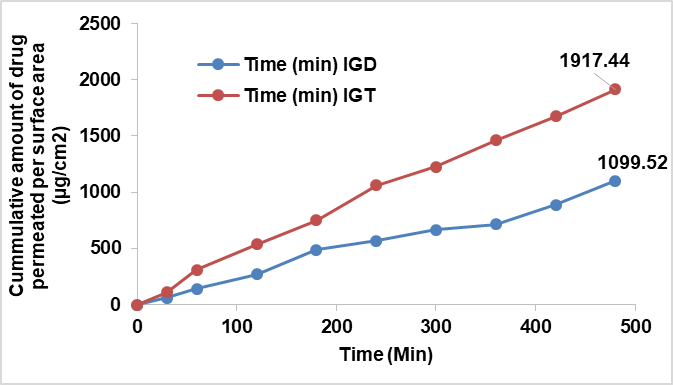 The drug release behaviour of IGT and IGD was studied using a semi-permeable cellophane membrane in Franz diffusion cells. The release profile of IGT demonstrated a sustained and prolonged release of LCZ over 8 h compared to the conventional IGD formulation, as shown in fig. 8. Drug release data were fitted to various kinetic models to determine the mechanism of release. Both the in situ gels, i. e., IGT and IGD, followed Higuchi kinetics with the highest regression coefficient (R²=0.997 and 0.985), respectively, as shown in table 5. The best fit of the release data to the Higuchi model indicates that diffusion is the primary mechanism governing drug release from the transferosomal in situ gel. This is consistent with the structural characteristics of transferosomes, which possess a flexible lipid bilayer that acts as a semipermeable membrane, facilitating sustained and controlled diffusion of the encapsulated drug. Moreover, when incorporated into an in situ gel matrix, the overall release process becomes further modulated by the gel’s viscosity and mesh structure. However, the dominant release behaviour remains diffusion-driven due to the gradual migration of drug molecules from the lipid vesicles through the gel matrix to the external medium [37, 38].