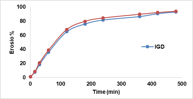 The erosion behaviour of the IGT and IGD was evaluated at 37±0.5 ° cover 8 h. Both formulations displayed a gradual and linear erosion pattern, reaching approximately 94% erosion at the end of the study. Although IGD showed in fig. 10, slightly faster erosion at earlier time points, the overall erosion profiles of IGT and IGD were comparable. This suggests that incorporation of transferosomes into the thermosensitive gel matrix did not significantly impact the gel's structural integrity. The observed erosion kinetics support a controlled and sustained drug release mechanism.