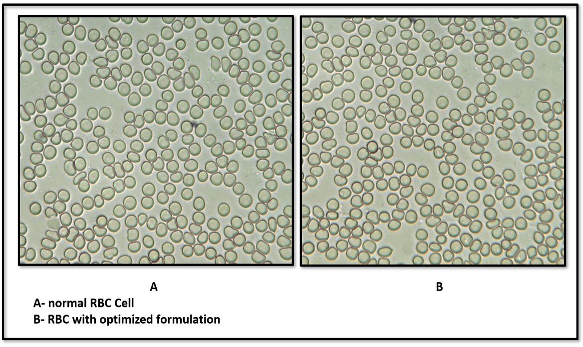 To evaluate the isotonicity of the optimised formulation, a few drops of blood were mixed with a few drops of the optimised formulation on a glass slide. This mixture was then smeared and observed under a high-resolution Biovis microscope. The procedure was similarly performed using saline water for comparison. The main focus during the observation was on the shape of the red blood cells (RBCs), particularly looking for any signs of shrinkage or bulging. The RBCs from the optimised formulation were compared with those from the saline water to assess differences in cell morphology [28].