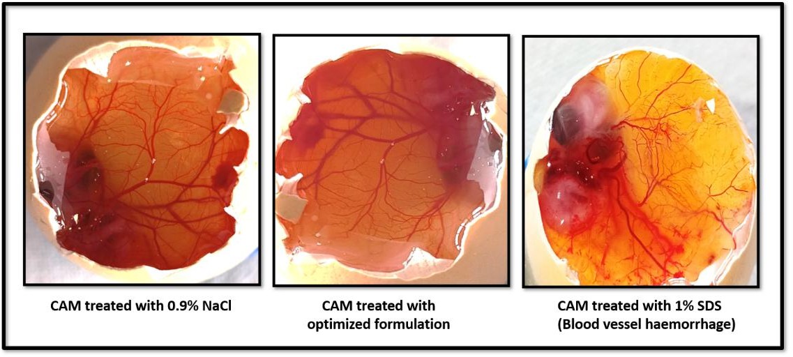 Several in vitro methods have been used to investigate the toxicity of potential eye irritants with a view to replacing in vivo eye irritation testing. In the HET-CAM test, chemicals are placed in direct contact with the chorioallantoic membrane of the hen's egg, which mimics the eye’s vasculature very closely [30]. The HET-CAM was utilized to conduct ex vivo ocular irritation and tolerance tests. Freshly gathered fertilized chicken eggs that are not more than seven days old were utilized in this test. Eggs that weighed between 50 and 60 g were used, and any that had physical flaws like cracking were excluded. The chosen eggs were kept in an incubator. To prevent embryo adhesion, eggs were physically rotated five times on each day of incubation; later, eggs were candled, and damaged or nonviable eggs were discarded. After that, the eggs were transferred without rotating to the incubator by holding the larger end of the eggs upward and kept for a full day. On the ninth day, eggs were taken out, and the air cell was marked on the top. Holes were made in the eggshell’s air sac while avoiding harming the chorioallantoic membrane. Using a sterile surgical blade, one egg was first cracked open to examine the development of CAM. The maturation of visible veins on the surface confirmed the development of CAM. Additionally, three groups of eggs containing six eggs each were created: IGT, negative control (0.9% saline, which does not induce irritation), and positive control (10% w/v KOH), which is known to irritate the eyes. Using a micropipette, 0.3 ml of the test sample was added to the CAM surface once the egg surface had been removed, ensuring that at least 50% of the CAM surface was covered. The reactions on the CAM surface were monitored for 300 seconds. The occurrence of each of the endpoints—coagulation, vascular lysis, and haemorrhage was timed and recorded in seconds. The following equation was used to determine the potential irritancy (PI) score based on the duration of time essential for the endpoints to develop [31]: