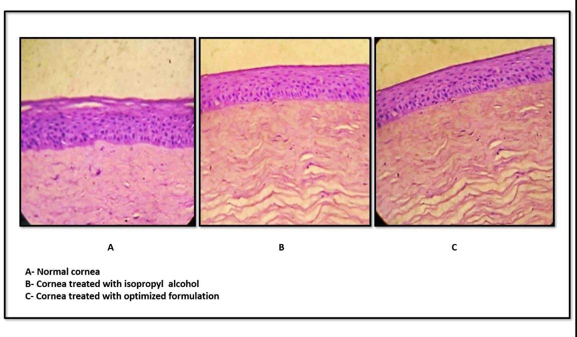 Histological examination of goat corneas treated with the optimized IGT revealed intact epithelial layers, well-organised stromal architecture, and normal endothelium, with no signs of necrosis, inflammation, or edema, as shown in fig. 14. These findings were comparable to both untreated and standard-treated corneas, confirming that the IGT formulation is non-irritant and safe for ocular application. The results further corroborate the ocular biocompatibility observed in isotonicity and HET-CAM studies.