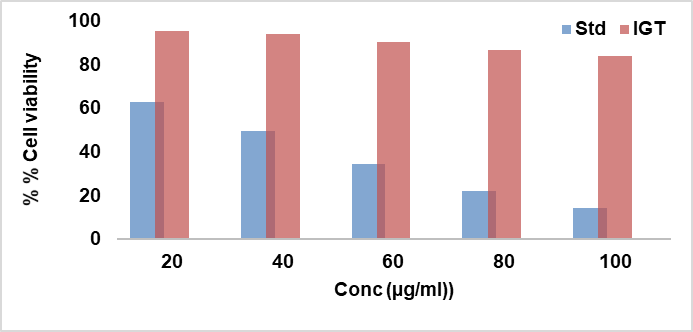 Cytotoxicity of various concentrations of IGT and standard (ethanol) on HCE-2cells was evaluated for 24 h by MTT assay. Percentage cell viability is plotted against concentration (µg/ml) as shown in fig. 15. The standard showed clear, concentration-dependent cytotoxicity toward HCE-2 cells, with percent inhibition increasing from 38.25% at 20 µg/ml to 86.09% at 100 µg/ml. The calculated IC₅₀ was 39.33 µg/ml, indicating moderate potency under these assay conditions. In contrast, IGT exhibited minimal cytotoxicity across 20–100 µg/ml. Inhibition rose modestly from 4.92% (20 µg/ml) to 16.86% (100 µg/ml), corresponding to 95.08–83.14% viability relative to vehicle control. An IC₅₀ was not estimable within the tested range (≤ 100 µg/ml). The MTT data demonstrate that, while the standard compound is cytotoxic to HCE-2 cells in a dose-dependent manner, IGT maintains high cell viability (≥ 83%) even at the highest tested concentration, supporting a favourable in vitro cytocompatibility profile for ocular applications within the tested concentration range [40].