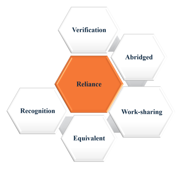 One of the primary types of regulatory reliance pathways is the abridged regulatory pathways that speed up approvals by allowing one regulatory authority to rely on decisions made by another trusted agency, keeping safety and quality standards intact in a timely manner. Recognition happens when a regulator fully accepts another agency’s decision, which can be one-sided or formalized through a mutual agreement. While the work-sharing allows multiple regulators to collaborate on tasks like clinical trial approvals, inspections, and post-market monitoring, reducing duplication. Joint assessments and inspections are examples where agencies review data together to improve efficiency [12]. The other type is the Verification model that permits the importation and local marketing of specific goods after one or more reputable reference organizations have approved them. The primary duty of the importing country's agency is to "verify" that the product meant for local sale has been registered adequately as stated in the application and that the product information for local marketing matches those specified in the reference authorization(s). Equivalence means two highly similar regulatory systems, based on shared standards, guidelines, and joint experiences, leading to consistent oversight and control [11].