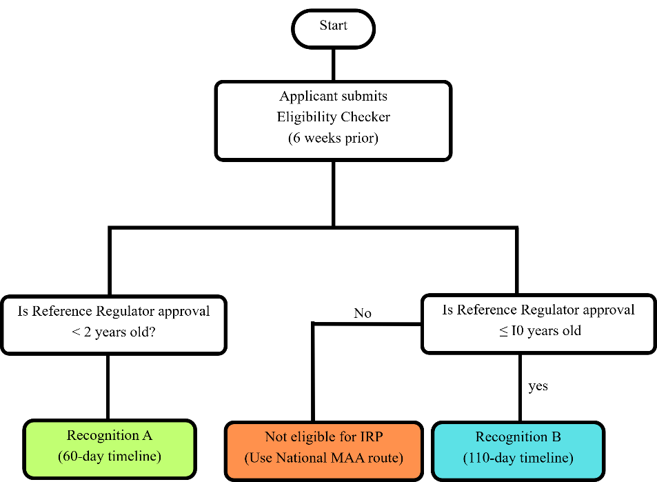The IRP has two routes: Recognition A (60-day timeline for approvals within two years) and Recognition B (110 d timeline for complex cases or approvals up to 10 y old). Fig. 3 depicts the flowchart of IRP pathways. Applicants must confirm eligibility six weeks before submission. The electronic Common Technical Document (eCTD) dossier must include RR (Reference Regulator) assessment reports, product details, and post-authorization changes. Recognition a follows strict timelines with no clock stops. Recognition B allows added flexibility, including extra manufacturing sites and updated data, with a clock stop at Day 70 for responses [23].