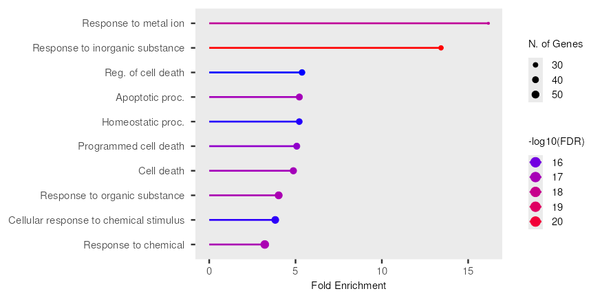From the plot, "Response to metal ion" exhibits the highest fold enrichment and is highly significant, as indicated by its deep purple colour. Similarly, "Response to inorganic substance" also shows a substantial fold enrichment and is among the most significant terms, appearing in red. Several GO terms related to cell death, including "Reg. of cell death," "Apoptotic proc.," "Programmed cell death," and "Cell death," are enriched to a lesser extent but still show notable significance (blue/purple). Other enriched terms include "Homeostatic proc.," "Response to organic substance," "Cellular response to chemical stimulus," and "Response to chemical," all displaying varying degrees of enrichment and statistical significance. The varying sizes of the circles across different terms suggest that the enriched biological processes involve different numbers of genes, providing insight into the scale of genetic involvement for each GO term.