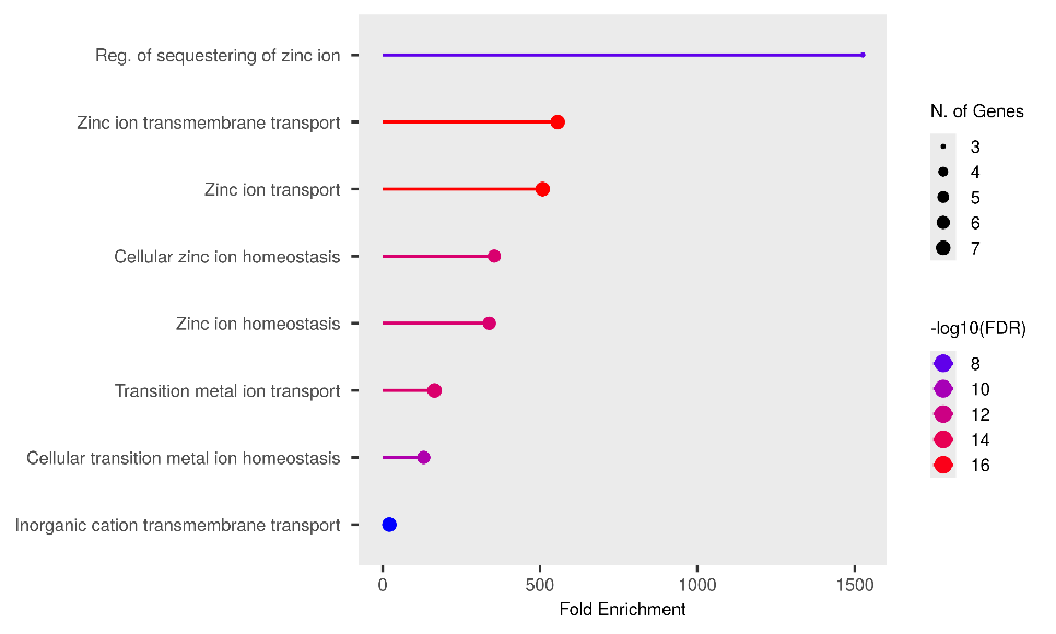 Proteins with the best topology analysis results in the zinc transporter cluster were further examined with gene ontology (GO) analysis using ShinnyGO 0.82 (https://bioinformatics.sdstate.edu/go/database), with the analyzed components being biological process, cellular component, and molecular function. As for pathway visualization using wikipathways (www.wikipathways.org) with the keyword “zinc homeostasis” [27].