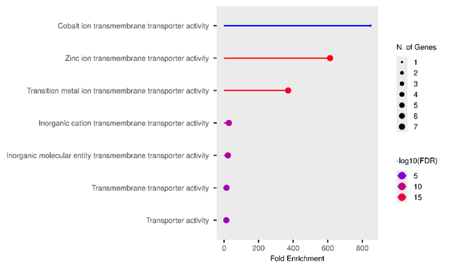 More specifically, fig. 4. (a), which focuses on Biological Processes, demonstrates that these genes are actively involved in the regulation and transport of zinc ions. "Reg. of sequestering of zinc ion" exhibits the highest Fold Enrichment (>1500) and an exceptionally high statistical significancs (−log10(FDR)approx16). Zinc serves as a vital cofactor for hundreds of enzymes and structural proteins, in addition to its roles in cellular signaling and immune responses [57]. Therefore, a tight regulation of zinc availability and localization is paramount for cellular function. This finding is consistent with literature indicating that zinc dyshomeostasis can contribute to various pathological condition [58]. Furthermore, the Cellular Component analysis in fig. 4. (b) predominantly highlights the localization of these genes to organelles involved in the endosomal-lysosomal/vacuolar pathway, notably the "Late endosome" and "Lysosomal membrane," with the highest Fold Enrichments (approximately 22 and 19, respectively) and high significance (−log10(FDR) approx2.75). Endosomes and lysosomes are critical sorting and degradation centers that also play a role in the storage and release of metal ions [59]. This correlation suggests that zinc management may be highly integrated with the cellular endomembrane system, facilitating regulated zinc uptake, storage, or release. Fig. 4. (c), illustrating Molecular Functions, confirms metal ion transporter activity as a dominant function, with "Cobalt ion transmembrane transporter activity" and "Zinc ion transmembrane transporter activity" being the most enriched and significant categories. Although "Cobalt ion transmembrane transporter activity" shows the highest Fold Enrichment (approximately 850) with only one gene, "Zinc ion transmembrane transporter activity" also possesses very high enrichment (approximately 600) but involves a larger number of genes (6-7 genes). This underscores that specific mechanisms for zinc and other transition metal transport across membranes are core functions of this gene set, highlighting the importance of transmembrane proteins in maintaining metal homeostasis [60].