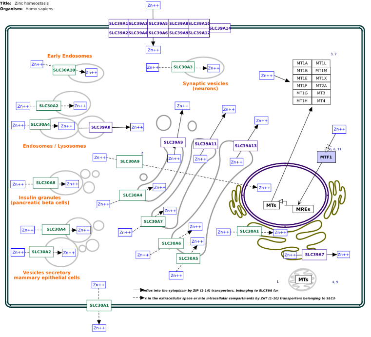 Kambe T, Hashimoto A, Fujimoto S. Current understanding of ZIP and ZnT zinc transporters in human health and diseases. Cell Mol Life Sci. 2014;71(17):3281-95. doi: 10.1007/s00018-014-1617-0, PMID 24710731.