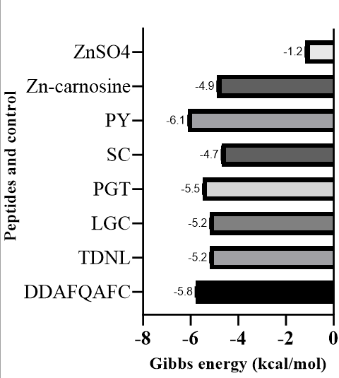 Fig. 6: Gibbs energy graph of zinc-binding peptides against the ZIP2 target protein. The most potent zinc peptide is PY (-6.1 kcal/mol), which is better than Zinc-carnosine (-4.9 kcal/mol)