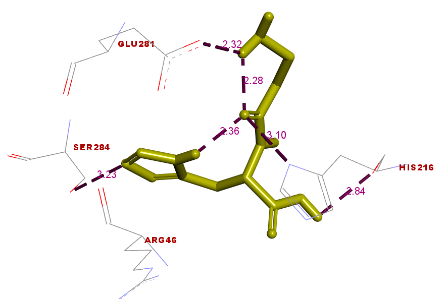 Fig. 7: Interactions between the PY peptide (yellow) and (a) Zn-carnosine (yellow) (b) docked to the ZIP2 protein