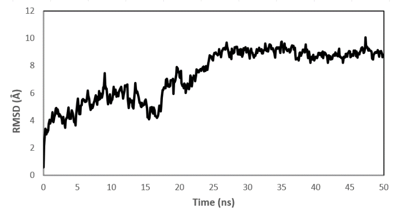 The protein binding complex with the test compound in pdb form is then input into the (www.yasara.org) and run with the md_run. mcr file. In the md_run. mcr file, several parameters need to be considered; the pH used, which is 7.4; ions Na and Cl, a temperature of 298K, the shape of the cube simulation box, a duration of 50 ns or 50000 ps, a save interval of 10000 ps or every 10ns, and an Amber14 forcefield. The results of Rg, RMSD, and RMSF from molecular dynamics simulations are analyzed and visualization in YASARA analysis functions [34, 35].