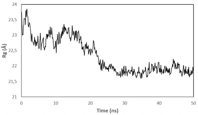 The RMSD result on the ZIP2 protein shows that there is an equilibrium phase, this protein has stability after 25 ns until the completion of the simulation (fig. 8.(a)). This indicates that the complex between ZIP2 and peptide PY is stable until the end of the simulation. Fluctuations occur at the beginning of the simulation up to 25 ns, this is due to interactions between each residue in the ZIP2 protein, including electrostatic interactions, hydrogen bonds, and interactions between ZIP2 and molecules in the peptide PY ligand. Fluctuations decrease after 25 ns until the end of the simulation, which indicates the stability of the complex between the ZIP2 protein and peptide PY.