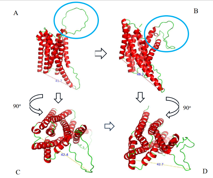 Fig. 9: (a) Conformational change of ZIP2 when interacting with PY peptide at 0 ns to 50 ns (b) A) ZIP2 structure before simulation, B) ZIP2 structure after 50 ns simulation, C) Transverse ZIP2 structure (rotated 90 ) before simulation, D) Transverse ZIP2 structure (rotated 90 ) after 50 ns simulation. There is a change in distance in the zinc-binding domain in the exterior of the ZIP2 protein in the extracellular part and in the zinc-binding domain in the exterior of the ZIP2 protein in the cytoplasmic part