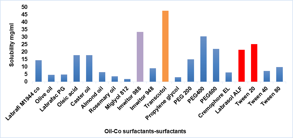 Fig. 1: Graphical representation of PCZ solubility in various oils, surfactants, and co-surfactants prepared in this study