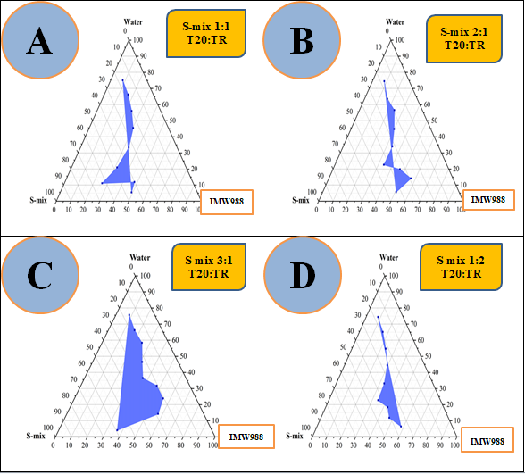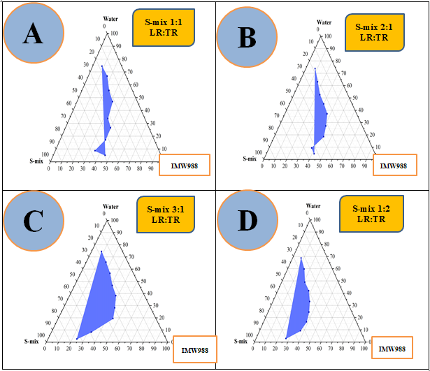 Based on the solubility studies, IMW 988, Tween 20 (T20), Labrasol ALF (LR), and Transcutol (TR) were selected as the oil, surfactant, and co-surfactant, respectively, for the preparation of the NEs. Pseudo-ternary phase diagrams were constructed using the water titration method to identify the NE regions and select the optimal combination. Surfactant and co-surfactant, which are both represented as S-mix, were mixed at various weight ratios (1:1, 2:1, 3:1, and 1:2 w/w) to determine the phase diagram's productivity. For each ratio, oil was added and blended using a vortex mixer to form a mixture with nine different S-mix ratios (ranging from 1:9to9:1w/w). The homogeneous yellowish-transparent S-mix was titrated by adding distilled water (DD) slowly, drop by drop, with continuous gentle magnetic stirring. To verify the phase clarity, the mixture was visually inspected after each water addition. Titration was stopped once the system turned turbid or formed a viscous, gel-like texture. The percentage weights of oil, S-mix, and water in the mixture were then calculated to define the phase boundaries in each diagram, and the data were plotted using Original Lab software. The NE's area, which is considered to be visually clear, was the shaded one in a triangle plot with one apex representing the oil, the second one representing water, and the third representing the S-mix at a fixed weight ratio [12-14].