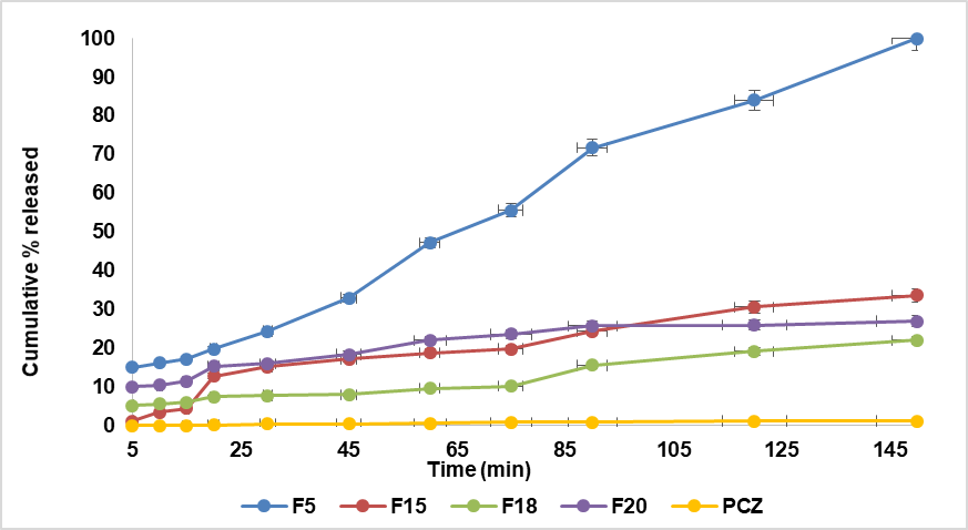 Results: Among the tested formulations, F5 was optimized, demonstrating superior physicochemical characteristics. It showed the highest drug content (99.87%±0.20), a droplet size of (102.9±0.12 nm), a polydispersity index (0.28±0.008), and a zeta potential of (-29.45±0.09 mV). In vitro drug release revealed complete PCZ release (100%) within 150 min in citrate phosphate buffer (pH 4.5) with 1% Tween 80.