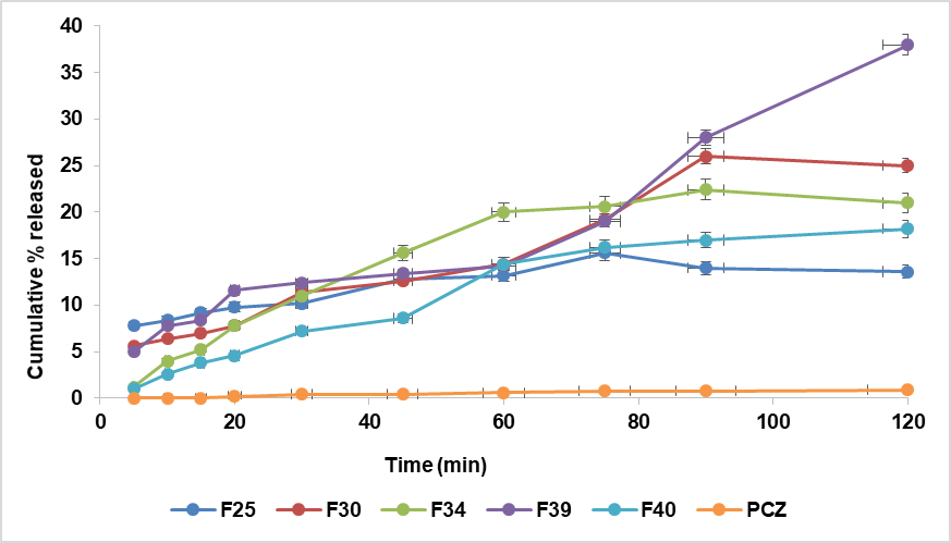 The in vitro release profile of the prepared formulations is shown in fig. 4. The pure drug (PCZ) released 1.2% at the end of 150 min, while the drug released from NEs formula F5 at the end of 150 min was 100%, F15 (30.6%), F18(22%), and F20(15.6%). But at end 120 min F25(13.6%), F30 (13.8%), F34(19.8%),F39(38%), and F40(18.2%). Droplet size affects the drug's quantitative release from the NE formulation [45]. As the droplet size decreased, the cumulative percentage of drug released significantly increased (p<0.05). Therefore, the smallest droplet size observed in F5 resulted in the highest cumulative drug release.