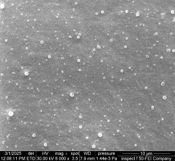 PCZ NE (F5) was examined using a field emission scanning electron microscope (FESEM). It is a device for analyzing the surface roughness that is used to explain the size and shape of the droplets in the PCZ NE [26].