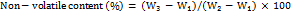 Non-volatile content: The sample (1 ml) was placed in a Petri dish and the weight of the empty petridish (W₁) was taken along with the sample before the test (W₂) in the hot air oven for 105 °C. After 1 h the dried sample was taken and cooled, and its weight was taken (W₃). It was calculated by using the following formula [13].