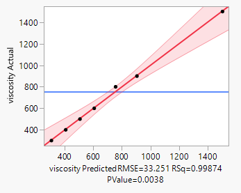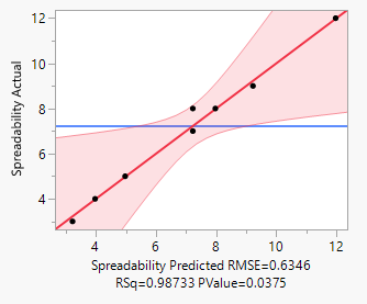 The actual versus predicted plots for viscosity and spreadability demonstrate a strong correlation between experimental and model-predicted values. For viscosity, the model exhibited an excellent fit with an R² value of 0.99874, a low RMSE of 33.251, and a significant p-value of 0.0038, indicating high predictive accuracy and reliability as shown in fig. 1. Similarly, the spreadability model showed a strong fit (fig. 2) with an R² value of 0.98733, an RMSE of 0.6346, and a p-value of 0.0375, confirming that the model adequately captured the variability in the data. The narrow confidence intervals and close clustering of data points around the regression line further validate the robustness of the predictive models for both responses.