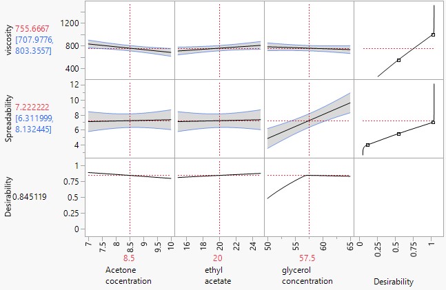 The prediction profiler demonstrated the combined influence of acetone, ethyl acetate, and glycerol concentrations on both the viscosity and spreadability of the formulation (fig. 3). A slight reduction in acetone concentration resulted in a decrease in viscosity, aiding better formulation flow, while maintaining adequate spreadability. Ethyl acetate concentration had a minor effect on viscosity but contributed moderately to improving spreadability. An increase in glycerol concentration led to an enhancement in spreadability, while also stabilizing viscosity within an acceptable range. Overall, the desirability plot indicated that the formulation achieved optimal properties when the independent variables were maintained within specific limits.