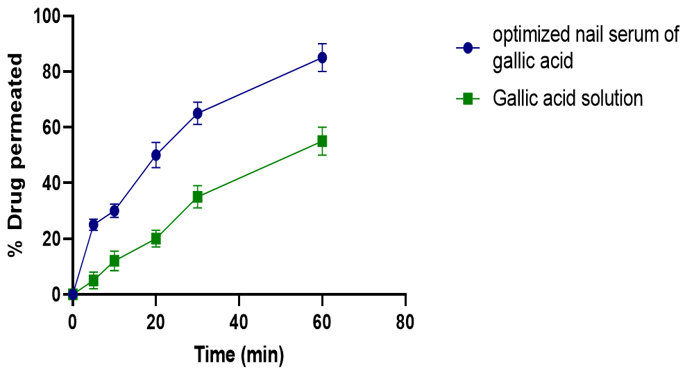 An in vitro drug permeation study was performed in the Franz diffusion cell for 60 min using phosphate-buffered saline (PBS) as the medium for release. The quantification of gallic acid released at specific intervals was achieved through UV-visible spectrophotometry at 261 nm. The study compared the drug permeation profiles of an optimized gallic acid nail serum and a gallic acid aqueous solution. Samples of 1 ml were taken at set times (0, 12, 24, 36, 48, and 60 min) and replaced with fresh PBS to maintain sink conditions. The fig. 4 illustrates that drug permeation from the formulation increased progressively over time. The optimized nail serum showed a notably higher permeation, achieving about 90% drug permeation at 60 min, while the aqueous solution reached approximately 65% at the same time. The improved permeation observed with the serum is likely attributable to the combined effect of glycerol and coconut oil, which function as permeation enhancers by hydrating and softening the dense keratin structure of the nail plate, thereby facilitating greater drug diffusion. Glycerol, as a humectant, maintains moisture within the nail matrix, increasing its porosity, while coconut oil may help to disrupt the lipid-protein interfaces in keratin layers [23]. Additionally, Tween 20, acting as an emulsifier, stabilizes the formulation and improves the uniform distribution of gallic acid, promoting consistent drug release and better contact with the nail surface.