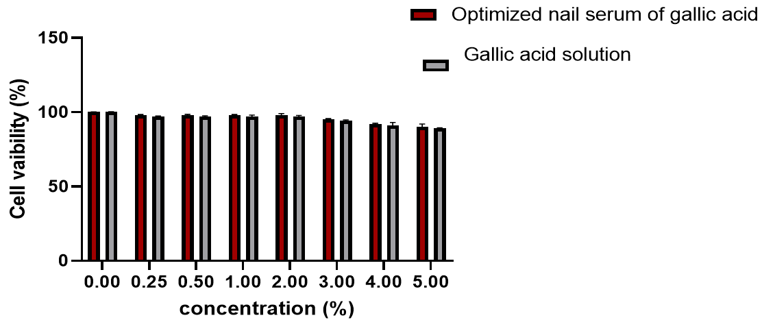 The in vitro cytocompatibility study was performed using an MTT assay in accordance with safety testing guidelines established by the Organisation for Economic Co-operation and Development (OECD). The in vitro cytocompatibility study was done using L929 fibroblast cells, which were maintained in Dulbecco's Modified Eagle Medium (DMEM) with the addition of 10% Fetal Bovine Serum (FBS) and 1% penicillin-streptomycin, at a temperature of 37 °C in an incubator with 5% CO₂. The cells were plated into a 96-well plate at a density of 5 × 10⁴ cells per well and left to adhere for 24 h. Various concentrations of optimized nail serum and gallic acid were introduced to the wells, followed by a 72 h incubation period. Wells treated with culture medium alone (0% concentration of test substances) served as the control group. Cell viability was evaluated using the MTT assay, with absorbance readings taken at 570 nm using a microplate reader to calculate viability percentages. Morphological changes were examined under an inverted microscope to evaluate cytotoxic effects. A high viability rate (>80%) indicates good cytocompatibility, whereas reduced viability points to cytotoxicity [20].