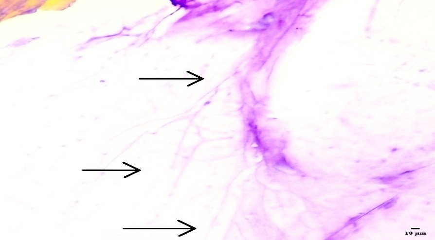 The histological section of hoof tissue infected with candida albicans are shown in fig. 8. The tissue displays abundant fungal structures, including pseudohyphae, blastospores (yeast cells), and hyphal elements, indicating active fungal invasion and tissue disruption [26]. In contrast, Fig. 9 (hoof tissue treated with the optimized nail serum) reveals a marked reduction in fungal structures, with no visible pseudohyphae, blastospores, or hyphae. The hoof tissue architecture appears preserved, indicating that treatment with the serum significantly decreased fungal growth. Similarly, fig. 10 (hoof tissue treated with the marketed formulation) also shows the absence of fungal elements, maintaining the integrity of the tissue. The substantial reduction in fungal colonization observed in fig. 9 demonstrates that the developed nail serum effectively inhibits candida albicans growth. The histopathological results indicate that the serum formulation exhibits antifungal efficacy comparable to the marketed product, thereby supporting its potential use in treating fungal infections of the nail or hoof tissue.