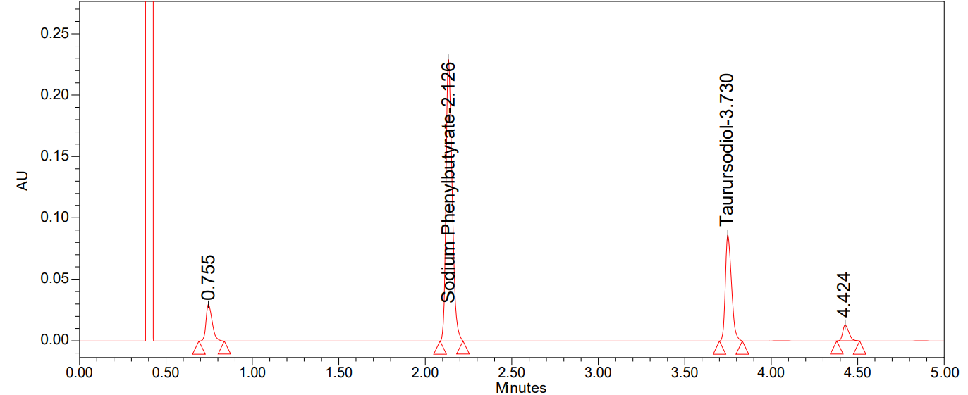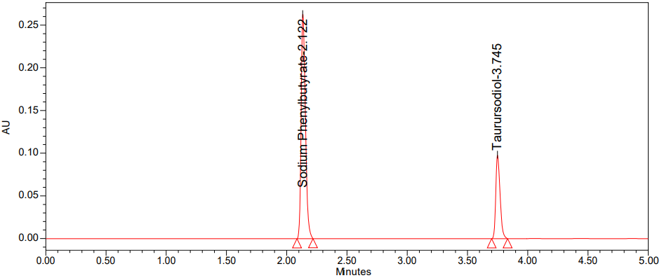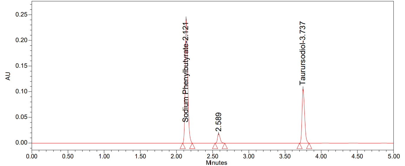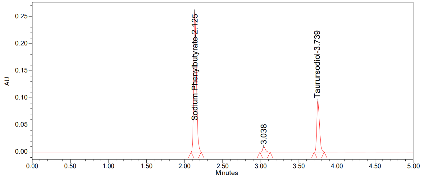 Accurately weighed 30 mg of Sodium phenyl butyrate and 10 mg of Taurursodiol working standards were transferred into a 10 ml volumetric flask, and 7 ml of diluent was added and sonicated to dissolve it. Then, the volume was made up to the mark with diluents (Concentration of Sodium Phenyl butyrate was 3000 µg/ml and 1000 µg/ml). Further, diluted 1 ml of the above solution was transferred into a 10 ml volumetric flask with diluent (Concentration of Sodium Phenyl butyrate was 300 µg/ml and 100 µg/ml). [A sonicator frequency of 40 KHz and a power of 360 W were used].