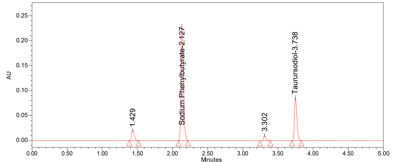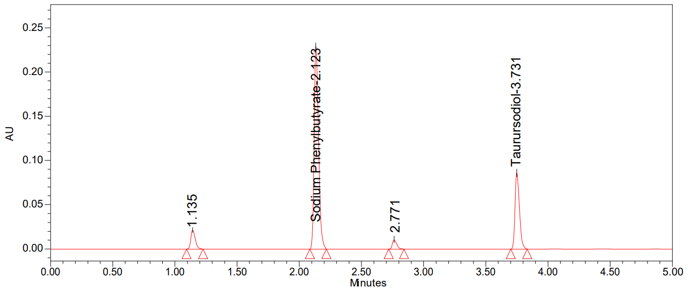 The samples were prepared by dissolving the sample powder equivalent to 30 mg of Sodium phenyl butyrate and 10 mg of Taurursodiol, and they were transferred into a 10 ml volumetric flask, and 7 ml of diluents was added, ultra sonicated for 20 min, and diluted up to 10 ml mark with diluents (Concentration of Sodium Phenyl butyrate was 3000 µg/ml and 1000 µg/ml). Further, diluted 1 ml of the sample stock solution was transferred into a 10 ml volumetric flask with diluents (Concentration of Sodium Phenyl butyrate was 300 µg/ml and 100 µg/ml). Finally, the solution was filtered by utilizing a 0.45 μ syringe filter before injecting into the LC column.