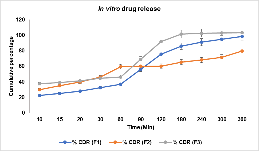 The study found a time-dependent drug release pattern (fig. 6) for all formulations (F1, F2, and F3). F2 showed a higher release than F1 and F3, possibly due to surface-associated drug dissolution. By 60 min, F3's release was slightly higher than F1 but lower than F2, indicating formulation-dependent release characteristics. F3 showed the highest release beyond 90 min, suggesting enhanced solubility and permeability. F1 followed a progressive release, reaching 98.38% at 360 min, while F2 exhibited a slower, more controlled release. The differences in drug release profiles among formulations highlight the role of excipient composition, polymer matrix, and particle size in modulating drug release kinetics. F2 is regarded as the optimal formulation based on the drug release, and additional analysis was conducted using F2. The Biphasic drug release observed in F2 can be attributed to an initial burst from the surface-associated drug, followed by controlled diffusion through the polymeric matrix. This sustained phase likely arises due to hydrogen-bonded entrapment within the lipid-polymer interface.