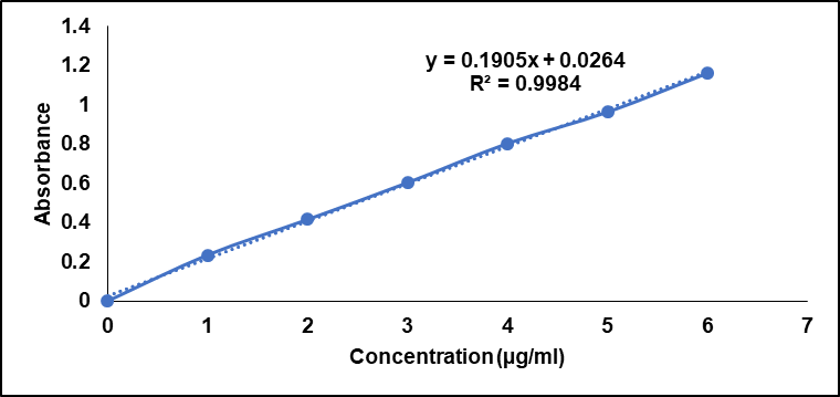 The calibration graph for CBD based on absorbance at an excitation wavelength of 241 nm was linear with CBD concentration and has R² = 0.9984. Achieving an R² value at such a high level indicates that the calibration model is highly suitable for measuring cannabis concentration with requisite accuracy, nonlinearity, and comparatively high resistance to various errors. The slope of the calibration curve, as shown above, was 0.1905, which implies that the absorbance unit rose 0.1905 units for every unit of CBD concentration. This is the intercept of the graph with an intercept of 0.0264; this is the absorbance of the sample, at least in the absence of CBDs; this could be due to interferences or intrinsic absorption of the solvent. This calibration range is accurate and reliable and shows that this calibration curve is suitable for the exact quantitative” determination of CBD in different formulations and to ensure the homogeneity of analyses to be done in further experiments.