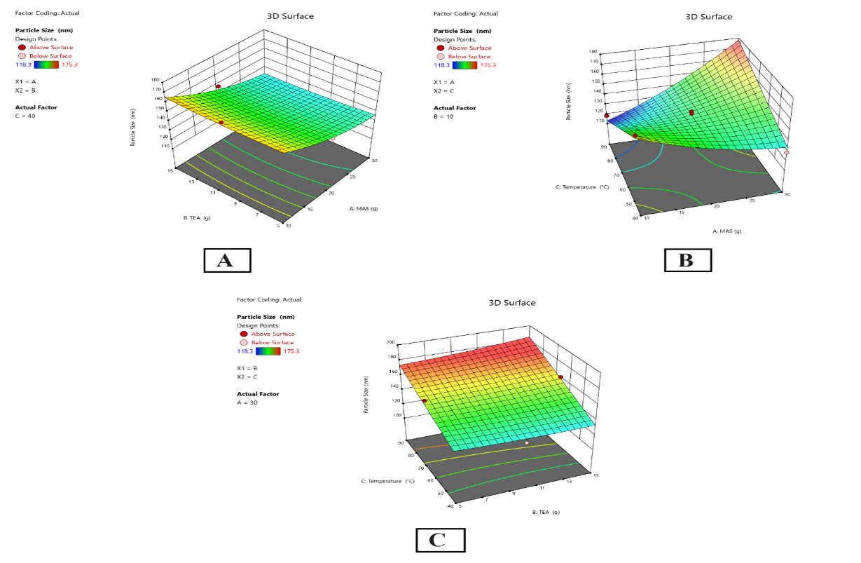 Fig. 5: 3D plot of the relationship between (A) MAS and TEA and the particle size, (B) MAS and temperature and the particle size, and (C) TEA and temperature and the particle size