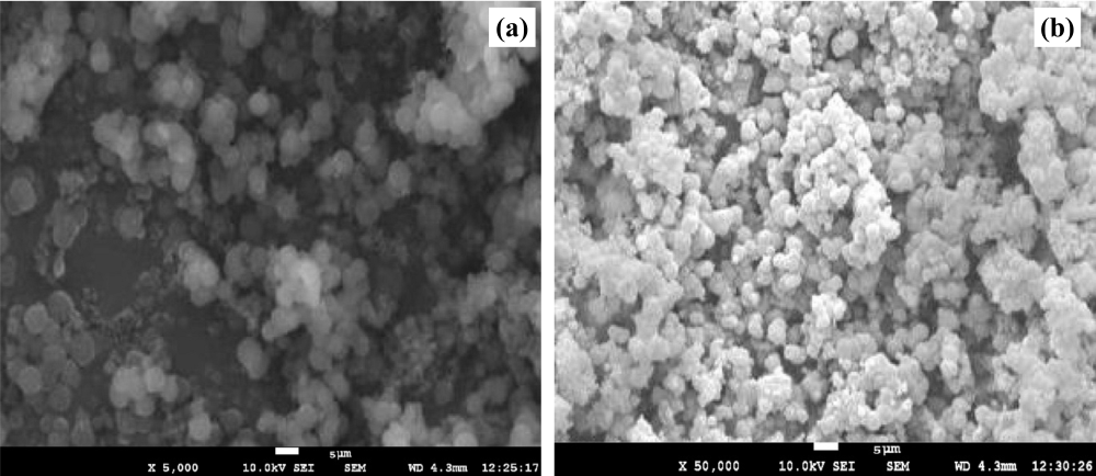 Fig. 6: Result of scanning electron microscopy of optimized batch (a) MASN at 5,000× magnification (b) CBD-MASN at 50,000× magnification