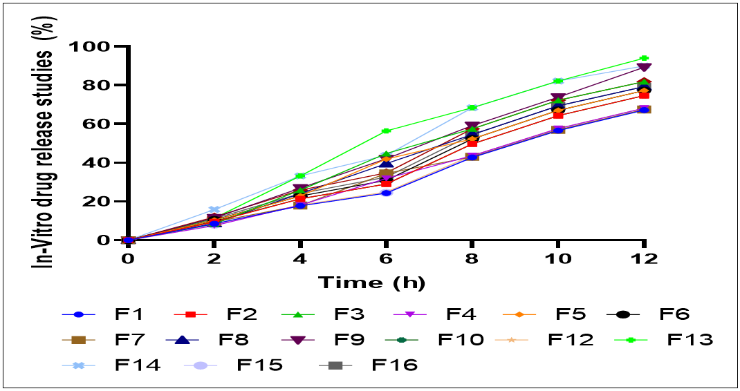 Fig. 8: In vitro drug release studies of CBD-MASN (F1-F16)