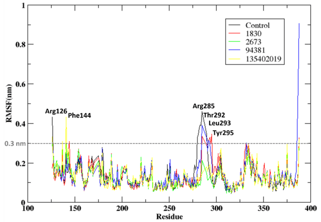 During 100 ns of MD simulation, the stability of the aurora A kinase binding site and the ligands (1830, 2673, 94381, and 135402019) as well as the control molecule are depicted in the RMSD plot in fig. 2(b). There is a high RMSD for 2673 and 135402019. It was observed that these ligands departed from the binding site as they show substantial fluctuation of RMSD in the range 10-25 nm range with time. This indicated that the ligand dissociated from the active site and their binding stability is weak. The RMSD is low for 1830 and 94381. The RMSD of these ligands remains modest in the range 0.2-0.5 nm all through the 100 ns MD run. Their consistent RMSD values, in contrast to those of 2673 and 135402019, show improved binding affinity and stability, suggesting robust retention in the binding pocket.