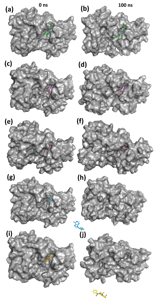 The control ligand stays anchored in the active site, but modest conformational alterations are evident after 100 ns, as illustrated in fig. 4(a, b). This signifies moderate stability with a certain degree of flexibility in binding. Here, 1830 persists in the binding pocket, exhibiting minor conformational alterations depicted in fig. 4(c, d). This indicates consistent interactions during the simulation, validating its potential as a robust inhibitor. Compound 2673 departs from the active site, signifying weak binding interactions as illustrated in fig. 4(e, f). The displacement indicates that 2673 lacks robust stabilising contacts, rendering it a less viable choice for Aurora A kinase inhibition. The Compound 94381 stays tethered inside the active site, exhibiting little positional alterations as illustrated in fig. 4(g, h). The steady placement indicates robust ligand-protein interactions, affirming 94381 as a potential inhibitor. Compound 135402019 entirely exits the binding pocket, signifying inadequate retention and low binding affinity, as illustrated in fig. 4(i, j). This verifies that 135402019 is not an appropriate candidate for further evaluation.